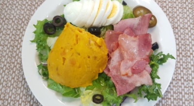 준비한 야채와 맛살을 넣고 계란을 하나 넣고 소금 후추를 뿌려줘요. 위에 야채를 더 넣고 치즈를 가득 올려주어요. 전자레인지에서 7분 정도 돌려주어요. 단호박을 먹기 좋게 썰어서 마무리합니다